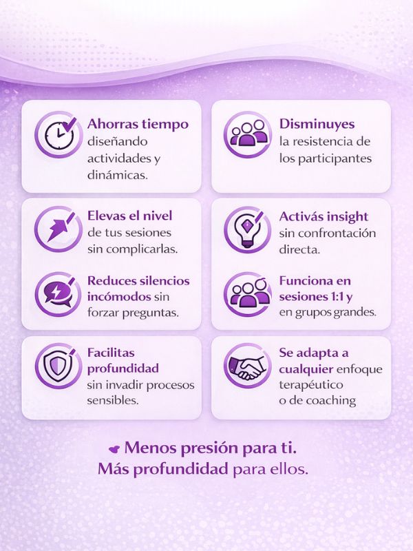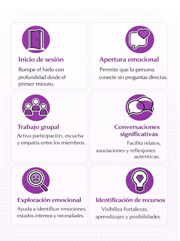 Funcionan muy bien en sesiones grupales, talleres y espacios formativos. Permiten que cada persona participe desde su propia vivencia, sin exponerse más de lo que desea, lo que facilita la participación y reduce resistencias dentro del grupo.