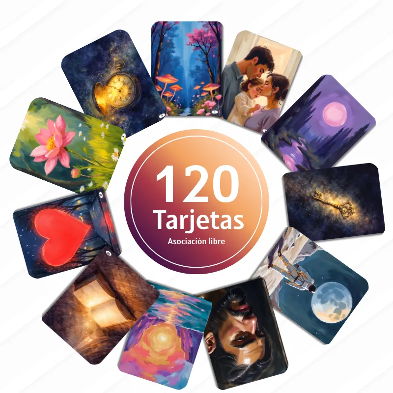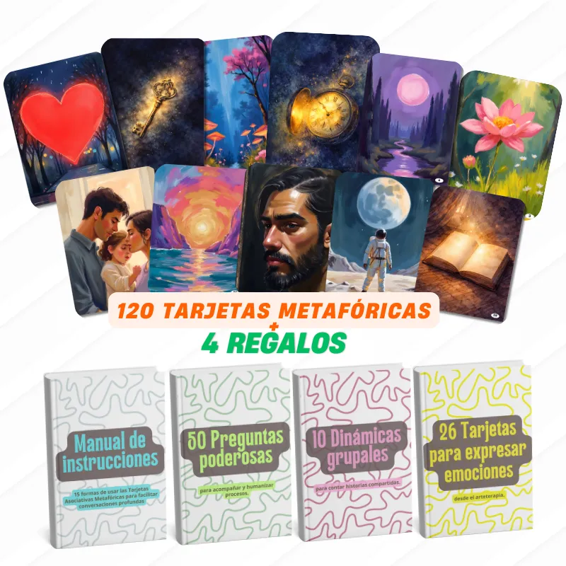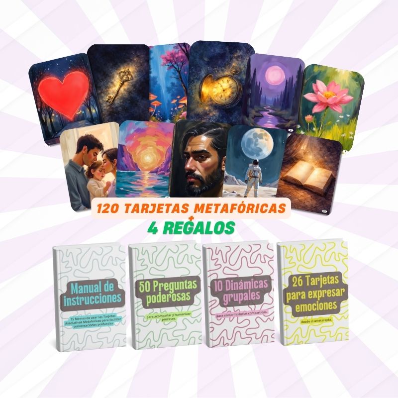 120 tarjetas metafóricas de asociación libre que te permiten iniciar sesiones, romper silencios incómodos y llevar a las personas de lo racional a lo emocional de forma natural y respetuosa.